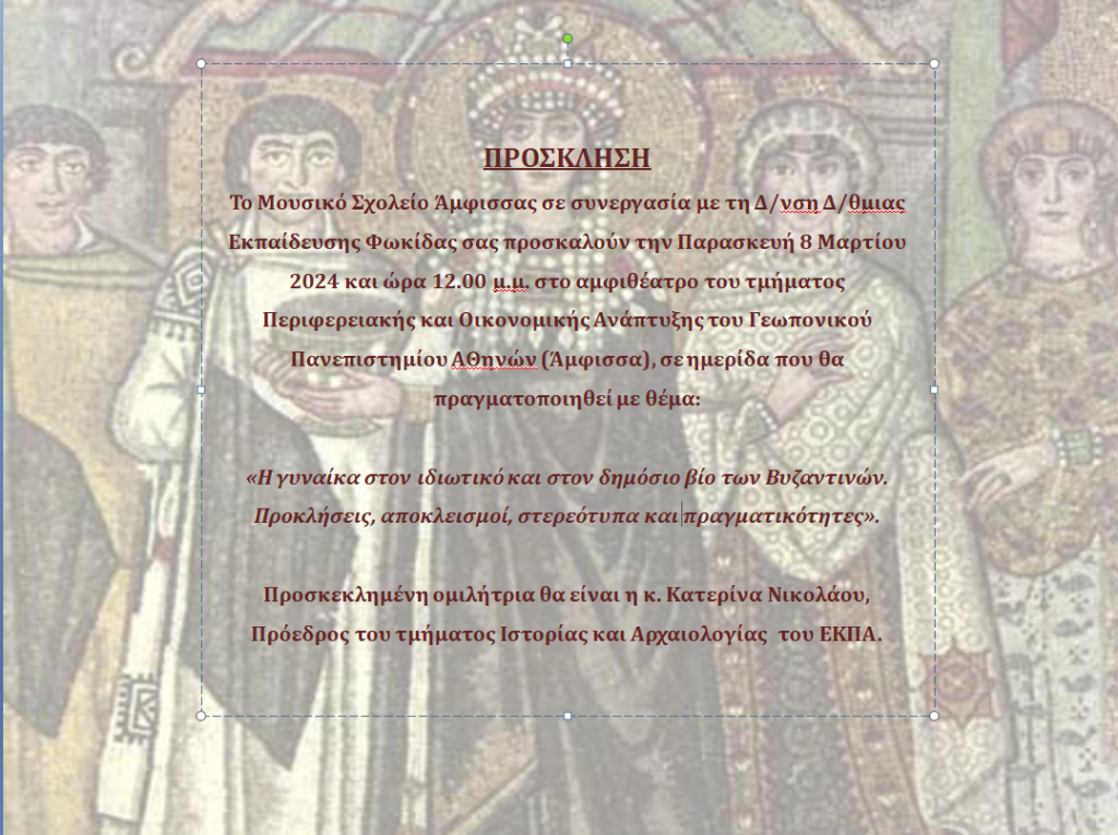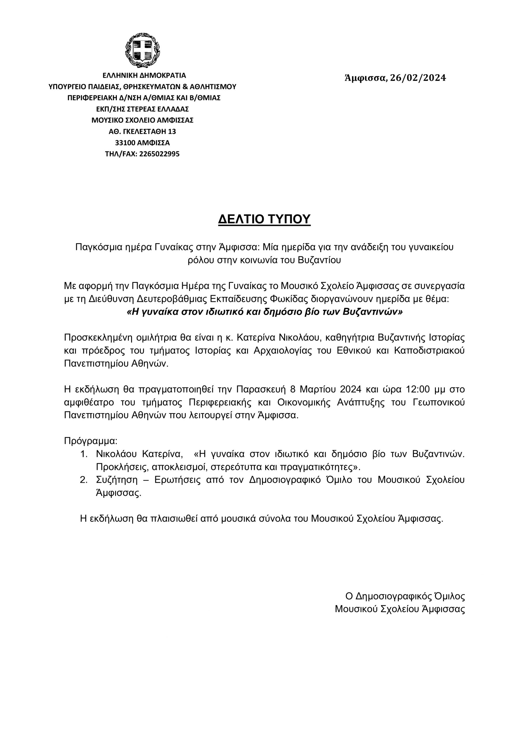 Στις 8/3/2024 στο αμφιθέατρο του τμήματος Περιφερειακής και Οικονομικής Ανάπτυξης του Γεωπονικού Πανεπιστημίου Αθηνών (Άμφισσα) γιορτάστηκε η Παγκόσμια ημέρα της Γυναίκας με τη διοργάνωση ημερίδας από το Μουσικό Σχολείο Άμφισσας σε συνεργασία με τη Δ/νση Δ/θμιας Εκπαίδευσης Φωκίδας με στόχο την ανάδειξη του γυναικείου ρόλου στην κοινωνία του Βυζαντίου. Προσκεκλημένη ομιλήτρια ήταν κ. Κατερίνα Νικολάου, πρόεδρος του Τμήματος Ιστορίας και Αρχαιολογίας της Φιλοσοφικής Σχολής του ΕΚΠΑ, η οποία πραγματοποίησε εισήγηση με θέμα: Οι γυναίκες στον ιδιωτικό και δημόσιο βίο των Βυζαντινών. Προκλήσεις, αποκλεισμοί, στερεότυπα και πραγματικότητες». Στην ημερίδα παρευρέθηκε και απηύθυνε χαιρετισμό η σύμβουλος παιδαγωγικής ευθύνης των σχολικών μονάδων γενικής αγωγής Β/θμιας Εκπ/σης και ΕΚ νομού Φωκίδας κα. Γεωργία Παντίδου. Οι μαθητές του δημοσιογραφικού και ραδιοφωνικού ομίλου του σχολείου, Ερικαίτη Γιαννουλάτου, Αγγελίνα Κουβάτη, Τριανταφυλλιά Κουτσογιαννοπούλου, Στεφάνια Ρίτσο, Βάσια Πάλλα και Παύλος Ζιακόπουλος παρουσίασαν την καλεσμένη στο κοινό και της υπέβαλαν ερωτήσεις που προέκυψαν από τη μελέτη των βιβλίων της «Οι βυζαντινές και ο πόλεμος. Ιστορίες γυναικών σε πολέμους του Βυζαντίου» και «Έρωτας και πολιτική στο Βυζάντιο. Επτά ιστορίες». Η εκδήλωση πλαισιώθηκε από μουσικά σύνολα του σχολείου σε έργα των Vivaldi, Χατζηδάκι και Σπανουδάκη.